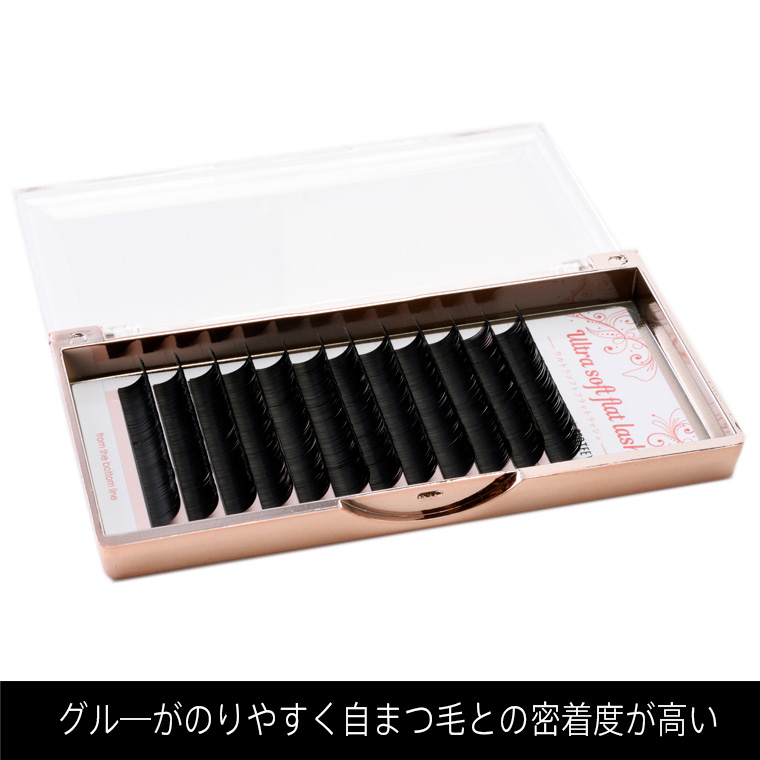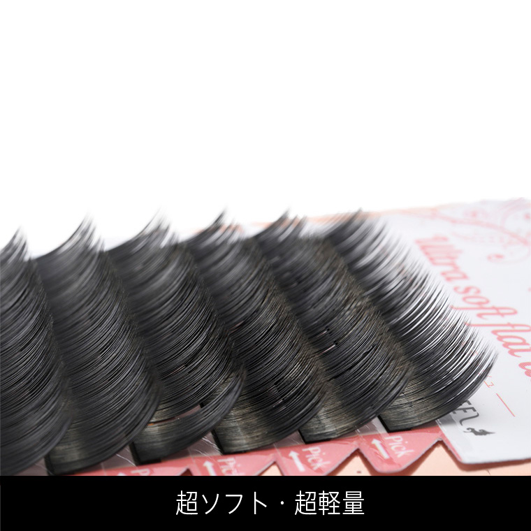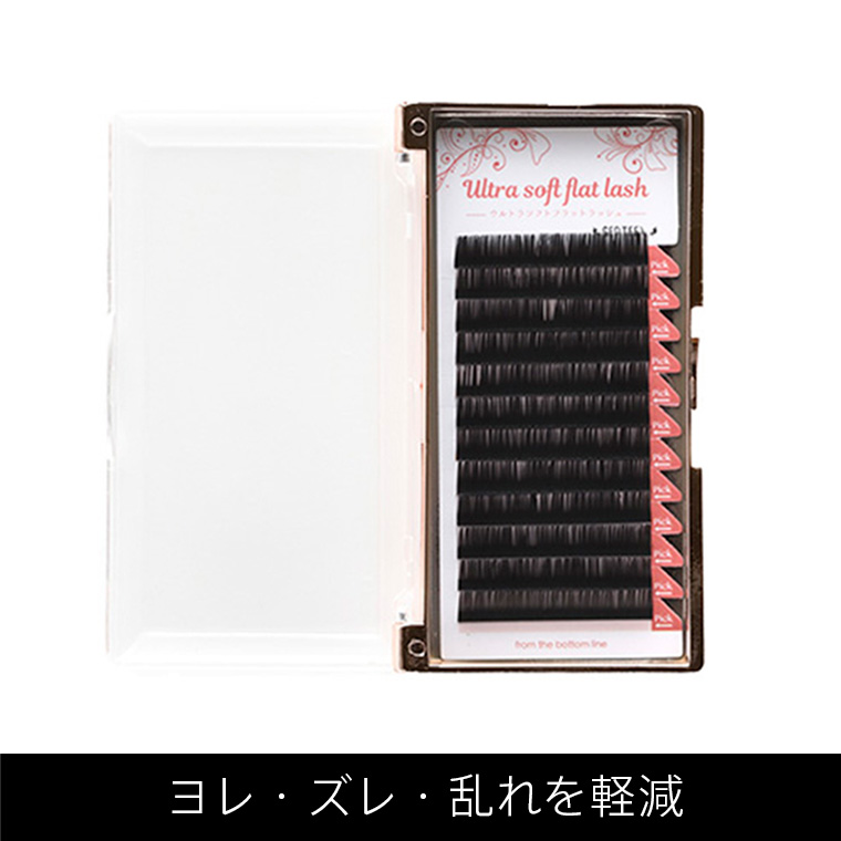 超ウルトラ級に柔らかいジェンティール独自の特殊繊維を使用したウルトラソフトフラットラッシュ。シングルラッシュを2本組み合わせたようなリボン型形状により溝の部分にグルー量が少なめでも自まつげとの密着度が非常に高くなります。そのためアイリスト様の作業性が抜群にアップして施術時間の短縮、持続力のアップにつながります。