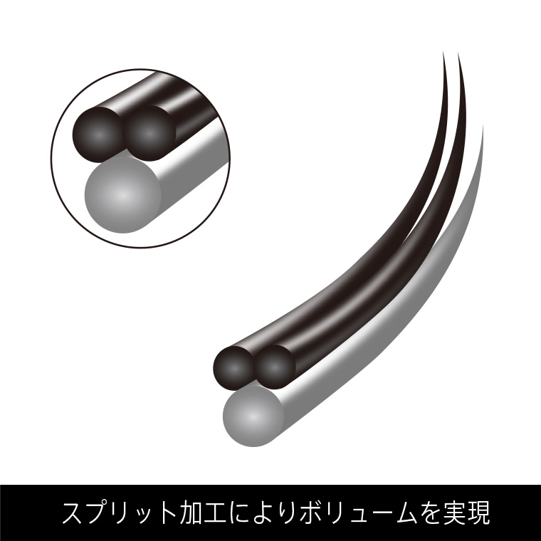 また、シングルラッシュと比べて1/3の軽さまで実現でき自まつげへの負担を最小限に抑えることができました。先端部は「スプリット」という特殊加工により、さらなるボリューム感を演出してくれます。